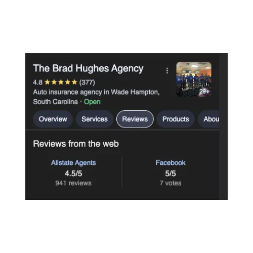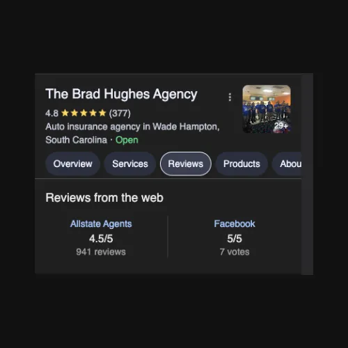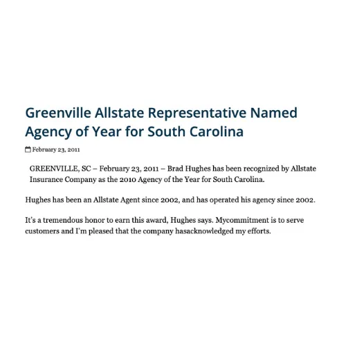 The Brad Hughes Agency was founded by a South Carolina native with one vision in mind: to provide South Carolina residents with a reliable and prompt insurance experience with coverage they can count on. With hundred of Five- Star Google reviews and multiple ‘Agency of the Year’ awards, we’re proud to be one of South Carolina’s most trusted names in home and auto insurance.